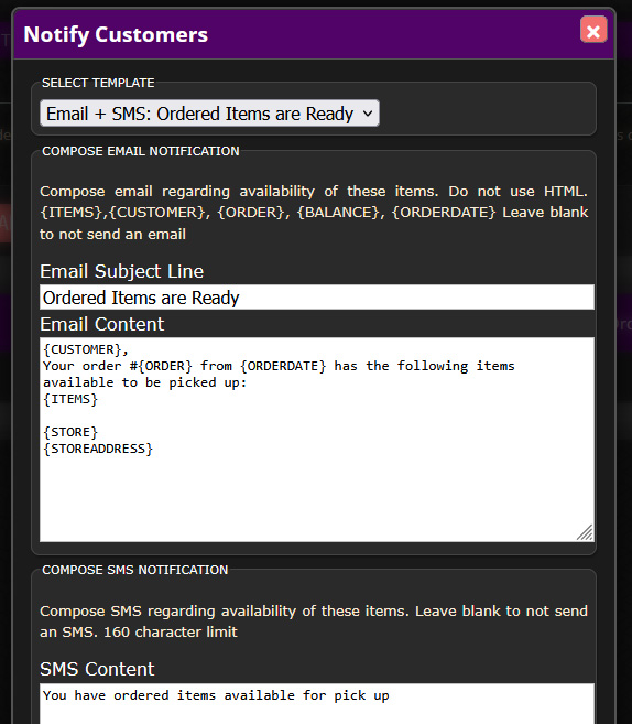 You can notify customers right from the POS! Simply check the box for each order (shown above on the left) and click Notify. You’ll then have the ability to type an email and/or text message to send to the customer so they know their items are ready.