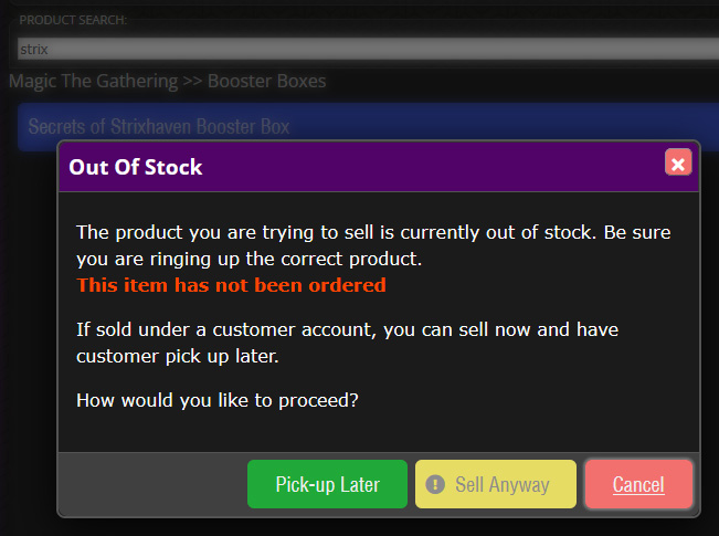 - Sell Anyway: Used for instances where you’re selling something you have in your store but inventory levels are, for some reason, not accurate.