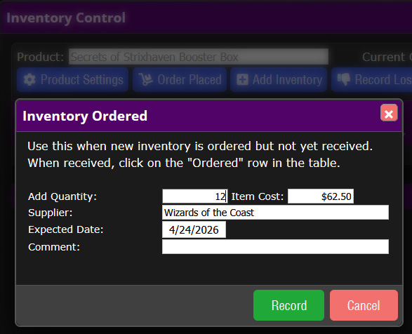 To log a vendor order, click the Order Placed button on the Inventory Control pop-up (accessible from various screens in the POS).